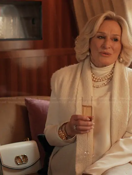 Dina Standish (played by Glenn Close) on Alls Fair on Hulu was spotted wearing this white leather bag on Alls Fair on episode 'When We Were Young' (1x02) in Nov 2025. Dina's Bag is the Vain Flap Leather Chain Shoulder Bag by Valentino Garavani.