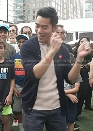 on Today on NBC was spotted wearing this navy heart patch cardigan on Today on Nov 05 2025's episode. 's Sweater is the Heart Logo-Appliqué Wool Cardigan by Comme Des Garçons Play.