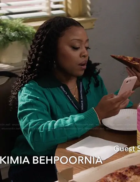 Janine Teagues (played by Quinta Brunson) on Abbott Elementary on ABC was spotted wearing this green check contrast collar sweater on Abbott Elementary on episode 'No Phones' (5x06) in Nov 2025. Janine's Sweater is the Collar Long Sleeve Knitted Sweater by Cider.