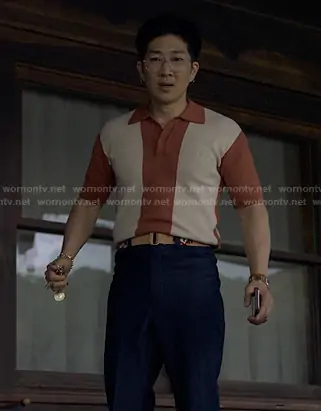 Daniel Kim (played by Tim Jo) on Reasonable Doubt on Hulu was spotted wearing this orange colorblock polo on Reasonable Doubt on episode 'D'Evils' (3x09) in Nov 2025. Daniel's Sweater is the Browne Knit Polo Sweater in Oak by Students Golf.