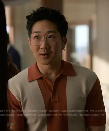 Daniel Kim (played by Tim Jo) on Reasonable Doubt on Hulu was spotted wearing this orange colorblock polo on Reasonable Doubt on episode 'On to the Next One' (3x10) in Nov 2025. Daniel's Sweater is the Browne Knit Polo Sweater in Oak by Students Golf.