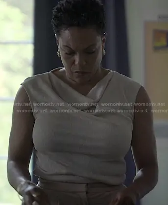 Rosie Edwards (played by April Parker Jones) on Reasonable Doubt on Hulu was spotted wearing this Rosie’s grey cowl neck top on Reasonable Doubt on episode 'D'Evils' (3x09) in Nov 2025. 's Top is the Sleeveless Drape Neck Blouse by Donna Karan New York.