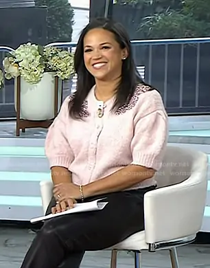 Laura Jarrett on Today on NBC was spotted wearing this pink embellished cardigan on Today on Nov 06 2025's episode. Laura's Sweater is the Millicent Cardigan by Cinq a Sept.