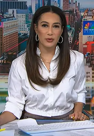 Morgan Radford on NBC News Daily on NBC was spotted wearing this white elastic waist shirt on NBC News Daily on Nov 06 2025's episode. Morgan's Top is the Fixed Sleeve Cotton Blend Shirt by Theory.