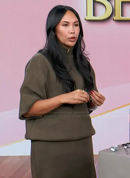 on Access Hollywood on NBC was spotted wearing this brown turtleneck sweater and skirt on Access Hollywood on Nov 06 2025's episode. 's Sweater is the Oversized Wool Sweater with High Neck by Zara . 's Skirt is the Wool Blend Straight Midi Skirt by Zara.