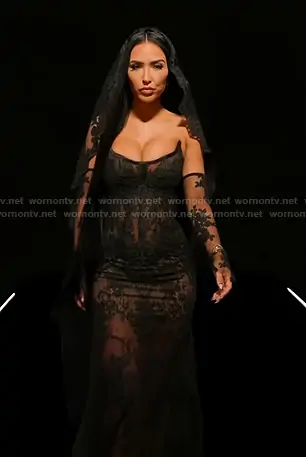 Bre Tiesi on Selling Sunset on Netflix was spotted wearing this black lace reunion dress on Selling Sunset on episode 'Reunion' (9x11) in Nov 2025. Bre's Dress is the custom dress made by Walter Mendez Atelier.
