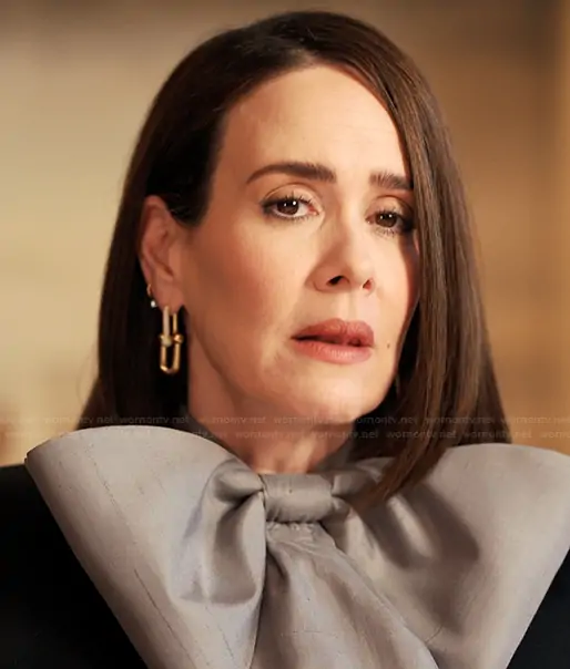 Carrington Lane (played by Sarah Paulson) on Alls Fair on Hulu was spotted wearing this crystal gold earrings on Alls Fair on episode 'I Want Revenge' (1x03) in Nov 2025. Carr's Earrings is the Large Link Earrings in Yellow Gold with Pavé Diamonds by Tiffany & Co.