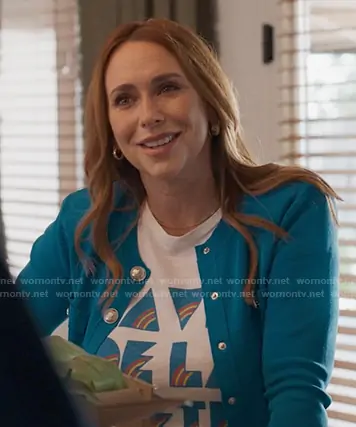 Maddie Kendall (played by Jennifer Love Hewitt) on 9-1-1 on ABC was spotted wearing this white graphic tee and blue cardigan on 9-1-1 on episode 'Día de los Muertos' (9x05) in Nov 2025. Maddie's Top is the The Lil Sinful Graphic Tee in La Vie De La Fete by Mother . Maddie's Sweater is the Toulouse Cropped Cardigan in Dresden Blue by L'Agence.