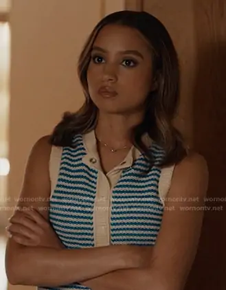 May Grant (played by Corinne Massiah) on 9-1-1 on ABC was spotted wearing this blue striped knit vest on 9-1-1 on episode 'Día de los Muertos' (9x05) in Nov 2025. May's Sweater is the Cropped Sweater Shell in stripe by J. Crew.
