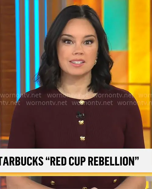 Jo Ling Kent on CBS Mornings on CBS was spotted wearing this burgundy cardigan with gold buttons on CBS Mornings on Nov 06 2025's episode. Jo Ling's Sweater is the Short-Sleeved Cardigan by H&M .