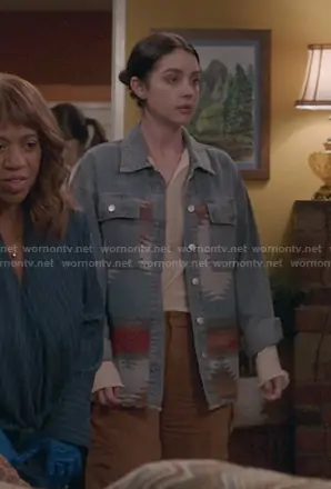 Jules Millin (played by Adelaide Kane) on Greys Anatomy on ABC was spotted wearing this aztec denim jacket on Greys Anatomy on episode 'Sometimes I Feel Like a Motherless Child' (22x05) in Nov 2025.