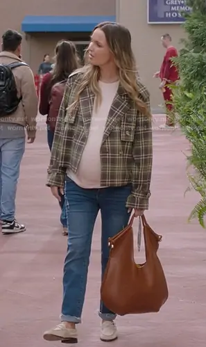 Jo Wilson (played by Camilla Luddington) on Greys Anatomy on ABC was spotted wearing this green plaid jacket on Greys Anatomy on episode 'Sometimes I Feel Like a Motherless Child' (22x05) in Nov 2025. Jo's Coat is the The Cropped Charles Plaid Trench Coat in Countryside Plaid by Favorite Daughter . Jo's Bag is the Tracy Tote by Melie Bianco.