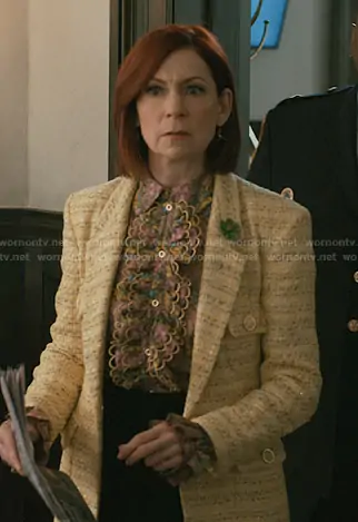 Elsbeth Tascioni (played by Carrie Preston) on Elsbeth on CBS was spotted wearing this print scalloped ruffle blouse on Elsbeth on episode 'Poetic Justice' (3x05) in Nov 2025. Elsbeth's Top is the Floral Print Carmen Miranda Blouse with Detachable Jabot by Maison Common.