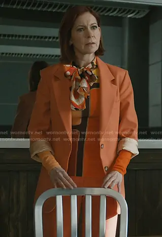 Elsbeth Tascioni (played by Carrie Preston) on Elsbeth on CBS was spotted wearing this orange blazer on Elsbeth on episode 'Poetic Justice' (3x05) in Nov 2025. Elsbeth's Jacket is the Single-Breasted Wool-Blend Jacket by Victoria Beckham.