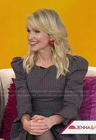 on Today on NBC was spotted wearing this grey plaid mini dress on Today on Nov 07 2025's episode. 's Dress is the Square Neck Mini Prairie Dress in Burgundy Tartan by Batsheva.