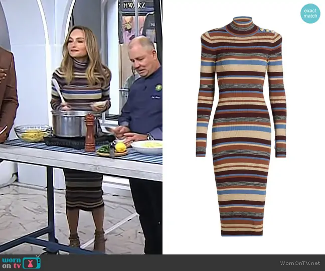 on Today on NBC was spotted wearing this striped turtleneck dress on Today on Nov 07 2025's episode. 's Dress is the Larelle Striped Midi Sweaterdress in Stone Blue Brown Multi by L'Agence.