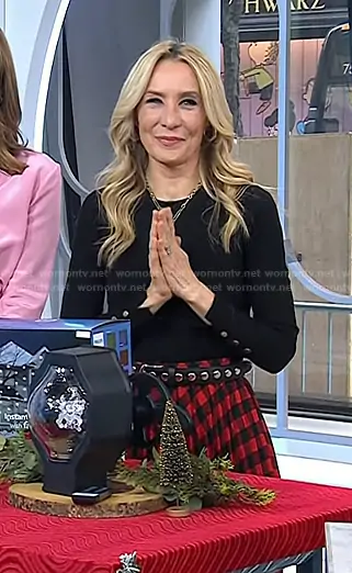 Chassie Post on Today on NBC was spotted wearing this black button sleeve sweater and red check skirt on Today on Nov 07 2025's episode. Chassie's Sweater is the Crew Neck Button Cuff Sweater by Zara . Chassie's Skirt is the Buffalo Check Midi A-Line Pleated Skirt by Woolrich x Target .