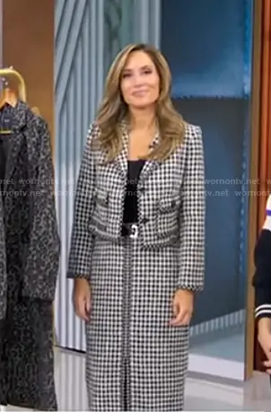 Rhiannon Ally on Good Morning America on ABC was spotted wearing this houndstooth jacket and pencil skirt on Good Morning America on Nov 07 2025's episode. Rhiannon's Jacket is the Textured Tweed Pocket Front Tailored Cropped Jacket by Karen Millen . Rhiannon's Skirt is the Textured Tweed Belted Tailored Pencil Skirt by Karen Millen.