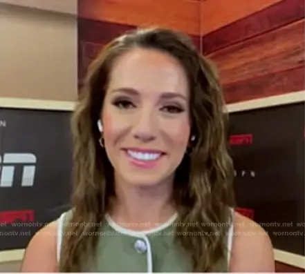 on Good Morning America on ABC was spotted wearing this green contrast trim sleeveless dress on Good Morning America on Nov 07 2025's episode. 's Dress is the Whistler Dress in Stone Army by Veronica Beard.