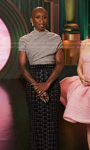 on The Voice on NBC was spotted wearing this grey gathered cross sweater and skirt on The Voice on Nov 05 2025's episode. 's Top is the Draped Knit Top in Grey by Balmain . 's Skirt is the Fall Winter 2025 Collection by Balmain.