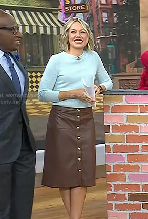 Dylan Dreyer on Today on NBC was spotted wearing this blue sweater and brown leather skirt on Today on Nov 10 2025's episode. Dylan's Sweater is the Audrey Cashmere Sweater in Light Soft Jade Heather by Talbots . Dylan's Skirt is the Faux Leather Skirt by Talbots.