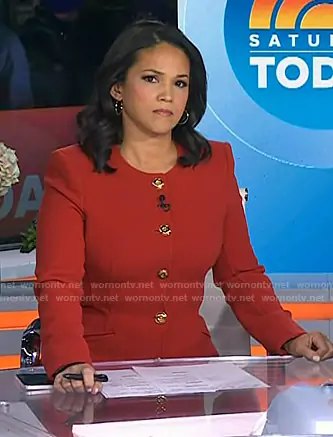 Laura Jarrett on Today on NBC was spotted wearing this red collarless blazer on Today on Jan 05 2026's episode. Laura's Jacket is the Jessup Tailored Jacket in Carnelian Red by Veronica Beard.