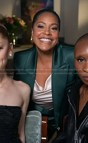 Sheinelle Jones on Today on NBC was spotted wearing this green blazer and pants on Today on Nov 11 2025's episode. Sheinelle's Jacket is the Silas Satin Blazer in Green Mystique by Alice + Olivia . Sheinelle's Pants is the Nessi High Waist Wide Leg Pants in Green Mystique by Alice + Olivia.