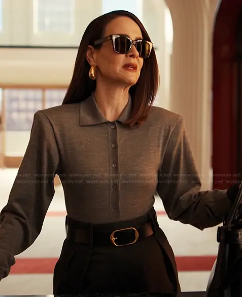 Carrington Lane (played by Sarah Paulson) on Alls Fair on Hulu was spotted wearing this gray padded shoulder bodysuit on Alls Fair on episode 'Everybody Dance Now' (1x04) in Nov 2025. Carr's Bodysuit is the Fine-knit polo-collar wool knitted body by Stella McCartney . Carr's Belt is the Nili leather belt by Nili Lotan . Carr's Sunglasses is the Bold 3 Dots Geometric Sunglasses by Celine . Carr's Earrings is the Large Drop Earrings by Bottega Veneta.