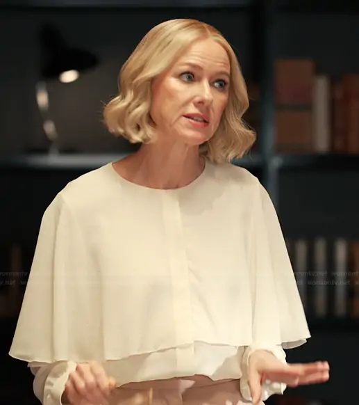 Liberty Ronson (played by Naomi Watts) on Alls Fair on Hulu was spotted wearing this white cape blouse on Alls Fair on episode 'Everybody Dance Now' (1x04) in Nov 2025. Liberty's Top is the Cape-design silk shirt by Chloe.