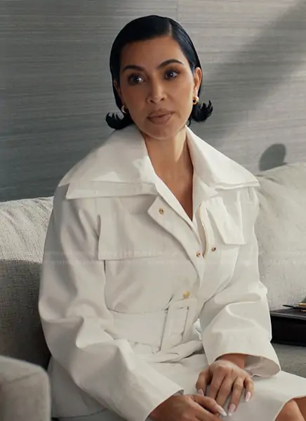 Allura Grant (played by Kim Kardashian) on Alls Fair on Hulu was spotted wearing this white trench jacket on Alls Fair on episode 'Everybody Dance Now' (1x04) in Nov 2025. Allura's Shoes is the 85mm Raquel D'Orsay pumps by Giuseppe Zanotti . Allura's Bag is the Brown Niloticus Crocodile Kelly 28 Bag by Hermes.