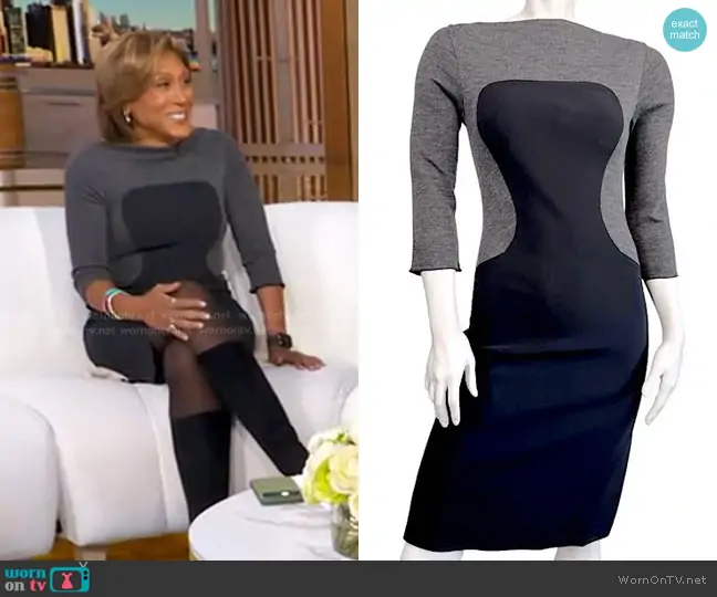 Robin Roberts on Good Morning America on ABC was spotted wearing this black and grey colorblock dress on Good Morning America on Nov 11 2025's episode. Robin's Dress is the Stretch Neoprene Bodycon Mini Dress by Chiara Boni La Petite Robe.