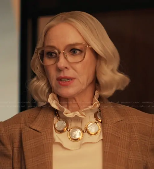 Liberty Ronson (played by Naomi Watts) on Alls Fair on Hulu was spotted wearing this gold necklace on Alls Fair on episode 'Everybody Dance Now' (1x04) in Nov 2025. Liberty's Necklace is the Shell Necklace by Kate Spade.