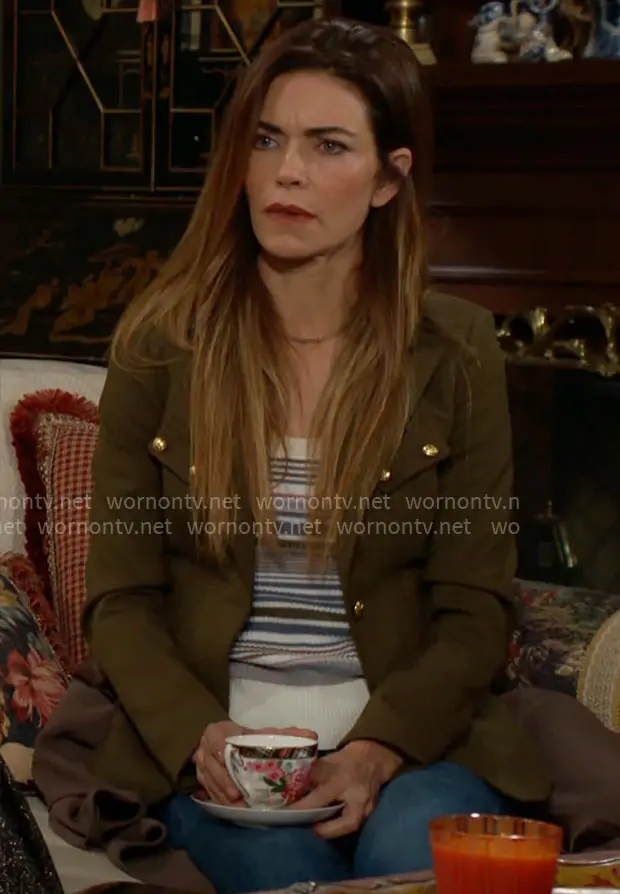 Victoria Newman (played by Amelia Heinle) on The Young and the Restless on CBS was spotted wearing this striped knit top and olive green jacket on The Young and the Restless on Nov 11 2025's episode. Victoria's Top is the Ezinna Tank by Veronica Beard . Victoria's Jacket is the Classic Blazer in Army by Smythe.