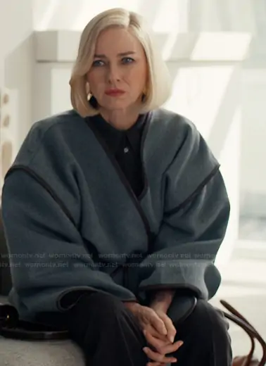 Liberty Ronson (played by Naomi Watts) on Alls Fair on Hulu was spotted wearing this gray piping trim jacket on Alls Fair on episode 'Everybody Dance Now' (1x04) in Nov 2025. Liberty's Jacket is the Wool Blend Blanket Coat by Helsa.