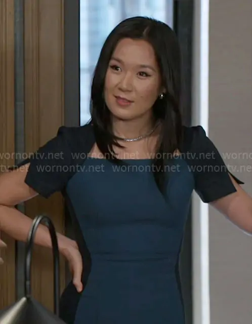Caroline Lee (played by Ellie Wang) on Beyond the Gates on CBS was spotted wearing this teal blue two-tone dress on Beyond the Gates on Nov 11 2025's episode. Caroline's Dress is the Daneria Colorblock Square Neck Sheath Dress by BOSS.