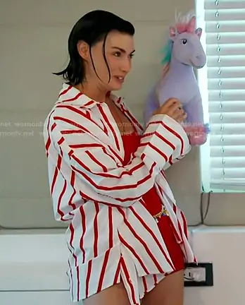 Bronwyn Newport on The Real Housewives of Salt Lake City on Bravo was spotted wearing this red striped oversized shirt on The Real Housewives of Salt Lake City on episode 'Unicorn Overboard' (6x09) in Nov 2025. Bronwyn's Top is the Reverie Striped Cotton Poplin Shirt by Elce.