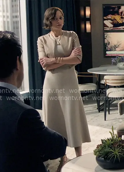 Celine Dumont (played by Marion Cotillard) on The Morning Show on Apple TV was spotted wearing this beige midi dress with cropped leather jacket on The Morning Show on episode 'Un Bel Di' (4x09) in Nov 2025. Celine's Dress is the Seymore Knit Midi Dress in Oatmeal by Gabriela Hearst . Celine's Jacket is the Stretch Leather Zip-Front Cardigan by Susan Bender . Celine's Shoes is the Rockstud Ankle Strap Sandals 90 MM by Valentino Garavani . Celine's Necklace is the Lexington Chain Necklace by David Yurman . Celine's Watch is the Serpenti Spiga Watch by Bvlgari.