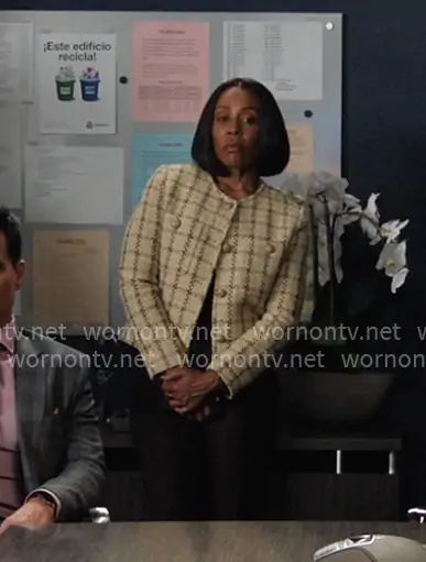 Mia Jordan (played by Karen Pittman) on The Morning Show on Apple TV was spotted wearing this checked tweed jacket on The Morning Show on episode 'Un Bel Di' (4x09) in Nov 2025. Mia's Jacket is the Collarless Patch Pocket Jacket by Lafayette 148 New York.