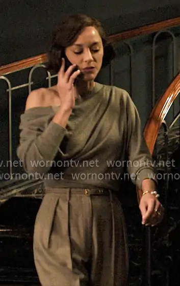 Celine Dumont (played by Marion Cotillard) on The Morning Show on Apple TV was spotted wearing this grey one-shoulder sweater on The Morning Show on episode 'Un Bel Di' (4x09) in Nov 2025. Celine's Sweater is the One-shoulder cashmere and silk sweater by Tom Ford.