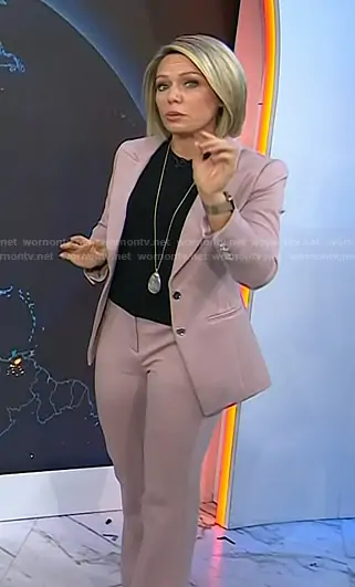 Dylan Dreyer on Today on NBC was spotted wearing this pink suit on Today on Nov 12 2025's episode. Dylan's Jacket is the Two-Button Blazer in Luster by White House Black Market . Dylan's Pants is the Blake Slim Boot Pant in Luster by White House Black Market.