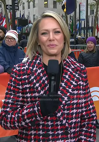 Dylan Dreyer on Today on NBC was spotted wearing this red tweed coat on Today on Nov 12 2025's episode. Dylan's Coat is the Sugarplum Tweed Coat in Indigo Blue Multi by Talbots.