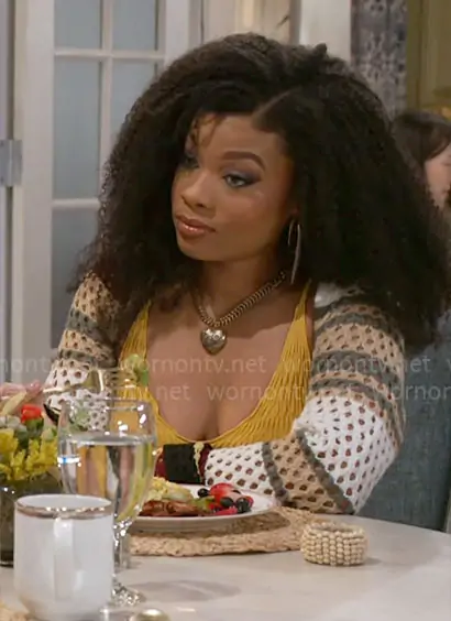 Eva Thomas (played by Ambyr Michelle) on Beyond the Gates on CBS was spotted wearing this yellow textured tank top and crochet shrug sweater on Beyond the Gates on Nov 12 2025's episode. Eva's Top is the Pucker Up Top in Citrus Grove by Free People . Eva's Necklace is the Etched Heart Choker Necklace by Urban Outfitters.