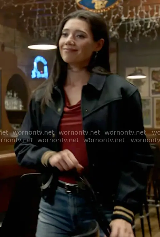 Violet Mikami (played by Hanako Greensmith) on Chicago Fire on NBC was spotted wearing this navy jacket with striped trims on Chicago Fire on episode 'Pierce the Veil' (14x07) in Nov 2025. Violet's Jacket is the Lennox Varsity Jacket by Levis.