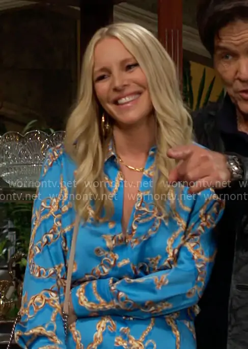 Christine Blair Williams (played by Lauralee Bell) on The Young and the Restless on CBS was spotted wearing this blue chain print shirtdress on The Young and the Restless on Nov 13 2025's episode. Christine's Dress is the Demie Mini Shirtdress by L'Agence . Christine's Bag is the Chevron Quilted Love Crossbody in Stone by Rebecca Minkoff.