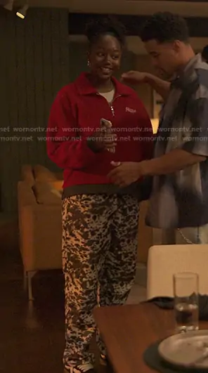 Naima Stewart (played by Aderinsola Olabode) on Reasonable Doubt on Hulu was spotted wearing this Naima’s red half zip sweatshirt and print pants on Reasonable Doubt on episode 'On to the Next One' (3x10) in Nov 2025. 's Sweater is the Reverse Fleece Quarter-Zip Sweater by Paper Planes . 's Pants is the tie dye polyka relaxed-leg pants by Nanushka.