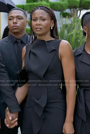 Jax Stewart (played by Emayatzy Corinealdi) on Reasonable Doubt on Hulu was spotted wearing this black sleeveless ruffle dress on Reasonable Doubt on episode 'On to the Next One' (3x10) in Nov 2025. Jax's Dress is the Normanhill Sculpted Maxi-Dress by Acler.