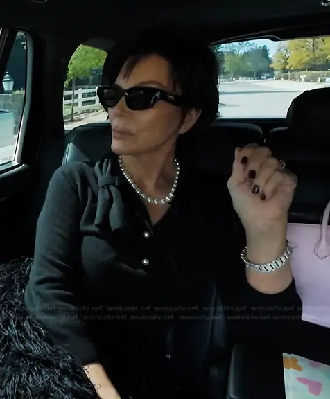Kris Jenner (played by Kris Jenner) on The Kardashians on Hulu was spotted wearing this black bow cardigan on The Kardashians on episode 'A Tragedy in Reality TV' (7x04) in Nov 2025. Kris's Sweater is the Tied Collar Sweater by Dior . Kris's Sunglasses is the Rectangle Frame Sunglasses by Bottega Veneta.
