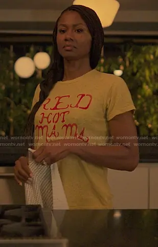 Jax Stewart (played by Emayatzy Corinealdi) on Reasonable Doubt on Hulu was spotted wearing this yellow Red Hot Mama tee on Reasonable Doubt on episode 'On to the Next One' (3x10) in Nov 2025. Jax's Top is the The Sinful Graphic Tee by Mother.