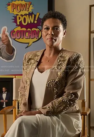 Rosie Edwards (played by April Parker Jones) on Reasonable Doubt on Hulu was spotted wearing this beige embellished jacket on Reasonable Doubt on episode 'On to the Next One' (3x10) in Nov 2025. 's Jacket is the Remini Embroidered Jacket by L'Agence.