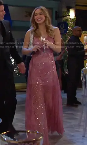 Holly Jonas (played by Ashley Puzemis) on Days of our Lives on Peacock was spotted wearing this pink embellished sheer dress on Days of our Lives on Nov 13 2025's episode. Holly's Dress is the Astro Embellished Slip Gown in Dusty Rose by Sabina Musáyev.